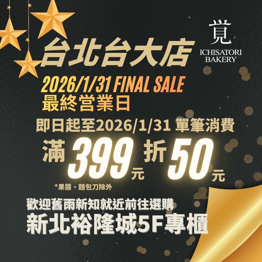 敬告熱愛一覺生吐司的好友們,台北台大店因營運調整,即將於 1/31 正式結束營業,在此特別感謝大家一路以來的愛護與陪伴,在這最後近三週的營業期間,一覺生吐司也將於台北台大門市提供特別優惠活動,來感謝大家長年以來的支持;歡迎各位把握營業最後期間,前往選購喜愛的品項。