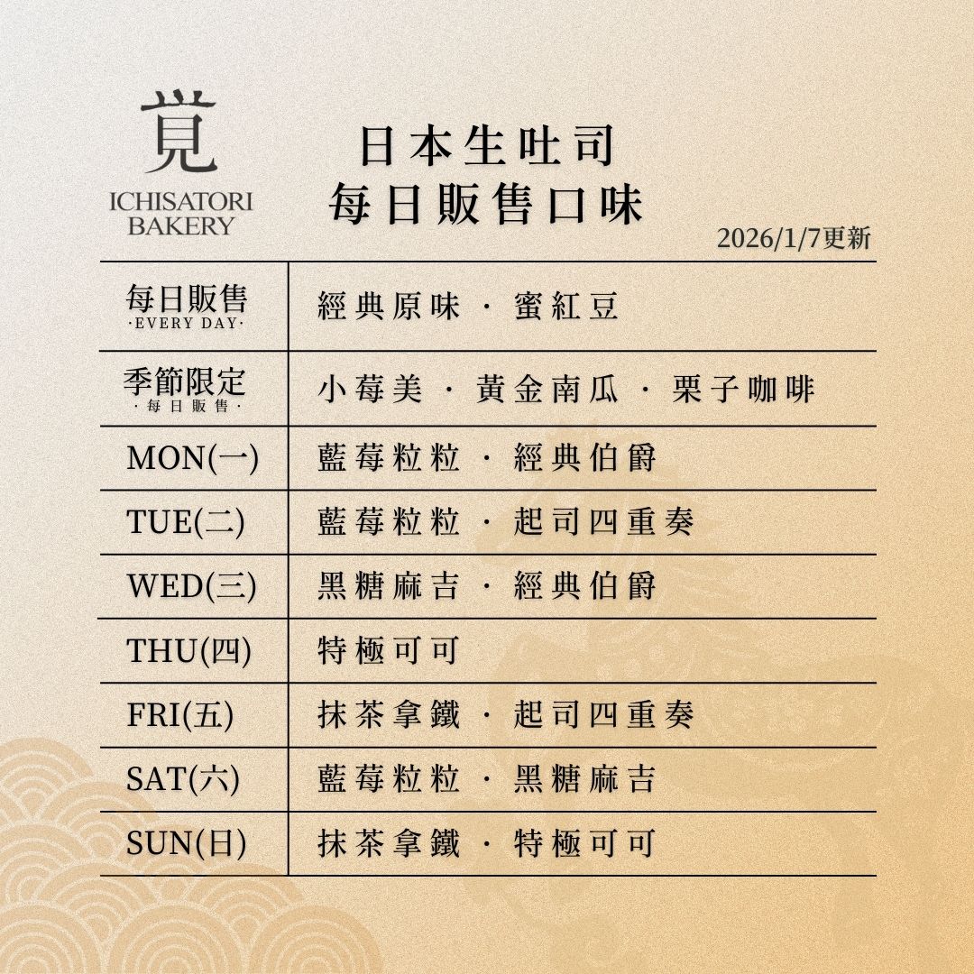A:『原味、蜜紅豆、皇家栗子乳酪及元氣紫米生吐司』每天都有販售,特殊口味出爐日期皆不相同,恕無法一次提供所有口味。
